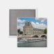 Louvre Museum in Paris, France on a beautiful sunny day with a water taxi sailing down the Seine River