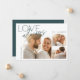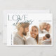 An elegant photo collage engagement announcement card featuring three photos (one square and two horizontal), with "love always" in modern block and script lettering along the top and left side. Personalize with your custom message (shown with "we're engaged!") and your names.