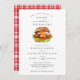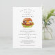 Cute wedding shower invitation card featuring watercolor illustration of a fried egg burger. The text says "all you need is love and burgers."