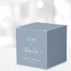 Chic dusty blue wedding favour box that features "love + thanks" in simple white typography and an elegant white script with swashes, your first names joined together by a heart and your wedding date.