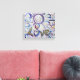 Guardian angel word art painting featuring "Love". The pink and white pastel angel is painted with colours accents of silver, purple, blue, gold, orange, and yellow. The acrylic painting has a textural contrast and sparkle from a light layer of glitter.