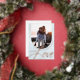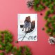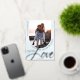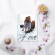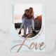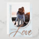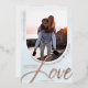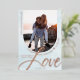 Arched frame photo save the date announcement with decorative rose gold foil "Love" and curved text. Soft pale blue with and plenty of room for a special message or additional photographs or information.