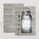 A Rustic Mason Jar on a barn board background decorates this RSVP. This easily compliments the rustic, country or barn wedding, and the tone of the background resembles drift wood, so this works equally well with the beach or destination wedding. Scroll down to see the complete collection.