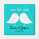This Save the Date Magnet has a cute graphic of love birds facing each other and an aqua teal background. This can be customized with your text and a different coloured background by choosing the customize it button and edit.