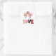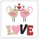 Adorable fancy birds share a sweet moment, with hearts above. Text reads, Love, with a heart for the "o".