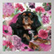 Black and Tan cavalier king charles spaniel art poster with floral background. Pink flowers, roses, carnations, hydrangea. Dog art. 16 x 16 inch
