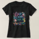 The "Love blooms here" t-shirt features a heartwarming and colourful design that radiates positivity. The text is displayed in playful multicolor typography, inspired by the vibrant hues of a sunset—orange, pink, purple, and yellow. Surrounding the text are abstract elements like soft clouds, radiant sunbeams, and subtle heart motifs, creating a cheerful and uplifting atmosphere.