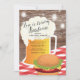 Unique invitation for a i do couples shower featuring a mug of beer set on a red chequered tablecloth with a hamburger set on a wood background.