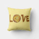 Decorative throw pillow features an original marker illustration of a tasty butternut crunch doughnut forming the O in the word LOVE. Perfect for your favourite foodie!