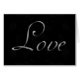 this is a great romantic note card (notecard) design with the word "love" written in silver script on a black patterned background. Its bold elegant classic style makes it perfect to use as a wedding or shower invitation and just as perfect to use as a notecard to that someone special justto say I love you.