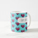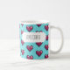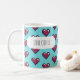 A mug for a coffee lover, featuring a simple classic red heart in a block pixel art style, arranged in a half drop repeat pattern on a greenish blue or turquoise background. Use "Personalize this template" to change the "Love Coffee" text if desired; changes are reflected on both sides. A funny or romantic gift with a pattern in the style of old games and retro 8 bit style images; an interesting alternative on a classic symbol of love or romance.