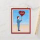 A cheerful, simply-drawn deliveryman in blue coveralls and a red cap brings the gift of love in the form of a big, red, heart-shaped balloon on this postcard. He stands on an open plain in front of a blue sky full of clouds. The customizable text on the heart can easily be changed to say whatever you like. From my original digitally created mixed media image.