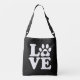 A love text design in white for dog lovers! This design features a dog paw print with a cut out heart in the middle. Shown here on a black, crossbody bag. Customize it with your own message, resize the design, and change the background colour if you like. It's a fun way to show how much you love your dogs! I know I love all three of mine!