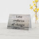 Quote from scripture from First Corinthians on love and endurance. Photo background is a distressed wooden table. Small cracks and grooves in the wood, in colour variation of light greys and browns. The image evokes seriousness and authenticity to any message such as sympathy on loss of a loved one. Blank inside for your own message.