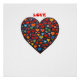 A large heart made of smaller hearts in various colours stands out against a white background. Above it, the word 'LOVE' is prominently displayed in bold red letters.