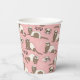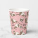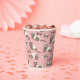 Hand-drawn ferrets, xoxo and hearts pattern paper cups, pink background.