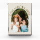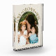 Modern and minimal family memory photo block featuring a photo in a arch frame with a text that says "Love Grows Here" with tiny hearts. Cream.