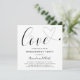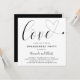Typography Engagement Party Invitation featuring the word, "love" in black calligraphy with a heart swash at the end, over a white background. The backside is solid black. The simple and minimal layout and lots of open space give this design a modern feel and the calligraphy lettering and hearts give it a romantic twist.