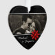 Black and white heart shaped Christmas photo ornament with red ribbon decoration. Personalize with your own photo and text. Click customize to reposition or resize your photo if needed.