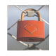 Red padlock with heart on a wire fence.