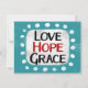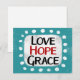 "Love Hope Grace" is a cute inspirational or motivational quote with a white accent shape surrounded by white textured whimsical dots.