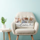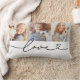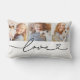 Modern and stylish custom lumbar throw pillow design features a photo collage of three (3) favourite photos with a simple and minimal black "Love" typography design that includes flourish and heart details. The black and white colours can be modified.