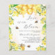 A stylish white and golden watercolored background. Decorated with bumble bees, melting honey and honeycomb with yellow florals, flowers and a honey jar. With the text: Love is in Bloom written with a modern hand lettered style script. Personalize and add the name of the bride.