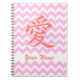 This stylish notebook features the Chinese and Japanese character for "Love," written in dark pink. The symbol appears on a pastel pink and white chevron-style zigzag background, with a space to add your own name or short message in a pink script font. If you would like to change the light pink zig-zag colour, click on "Customize it!" to select a different background.