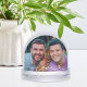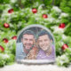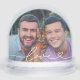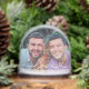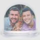 Modern and stylish custom snow globe design features a favorite photo with a minimal black "Love" typography overlay design that includes flourish and heart details. The white colored text can be customized.