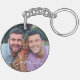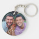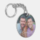 Modern and stylish custom keychain design features a favourite photo with a minimal white "Love" typography overlay design that includes flourish and heart details. The white coloured text can be customized.
