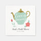 Elegant tea party themed bridal shower paper napkin. This product features a mint tea pot with gold embellishments with coral flowers on both sides. The text inside the pot says "Love is brewing." Customize this product by adding the bride-to-be's name and event date.