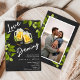 Celebrate your engagement with this Love Is Brewing brewery-themed photo invitation, featuring a black chalkboard background, hops and greenery, and golden beer details. The back includes space for your favorite photo, adding a personal touch to your fun and casual brewery engagement party. Perfect for couples planning a relaxed, modern celebration. Customize with your event details and photo, and add matching items from the suite to complete your brewery engagement party look.