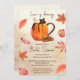 Love is brewing fall autumn bridal shower template invitation instant download, watercolor pumpkin cinnamon spices cup hot chocolate maple leaves, brown background for autumn fall themed bridal shower.