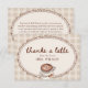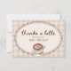 Celebrate the bride to be with this Love is Brewing Gingham Coffee Bridal Shower Thank You Card. Featuring a watercolor latte topped with heart foam art, coffee beans, "Thanks a Latte" in trendy script calligraphy, and a vintage scalloped frame over a warm beige gingham background, this cozy cafe inspired design brings rustic charm to your bridal shower stationery. Perfect for expressing gratitude to guests, this editable thank you card pairs beautifully with coordinating “Love is Brewing” invitations and party decor.