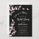 This elegant blush pink and black bridal shower invitation showcases the saying 'Love is in bloom,' adorned with beautiful blush pink cherry blossoms and two butterflies on a black background. The backside includes a QR code for the person of honor's gift registry.