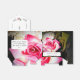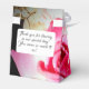 Design features the close-up image of a pink rose in full bloom as background to the names of bride and groom plus the date of wedding which is displayed in a lovely silver-coloured font on front. A white rectangular shape helps text to be seen clearly. Front flap features the image of a silver-coloured cross at top. The words, "Thank You!" appear on either side of two intertwined roses which are displayed in centre. Back features your personal message of gratitude in same elegant font.