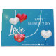 Happy Valentine's Day "Love is in the air" red and white balloons lovely and modern illustration. Text written in modern typography script letters framed with realistic 3D balloons in heart shapes on a blue sky background.