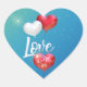 Happy Valentine's Day "Love is in the air" red and white balloons lovely and modern illustration. Text written in modern typography script letters framed with realistic 3D balloons in heart shapes on a blue sky background.