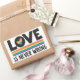 LGBTQ pride month stickers featuring the caption "love is never wrong" in black all caps fonts decorated with a little rainbow heart and a colourful stripe on a white background.