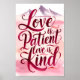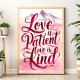 Celebrate the beauty of love with this heartfelt "Love is patient, Love is kind" wall art, inspired by 1 Corinthians 13:4. The design features elegant red script surrounded by delicate pink and red hues, faint silhouette of snow-capped mountains rises softly in the background, providing a serene and grounding effect