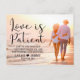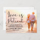 Announce your wedding date has been postponed with this custom photo love is patient change the date announcement postcard. This modern design template features your photo with text in black script that "Love is Patient" with a message and your names and town/state below. The back of the postcard has more of your wedding postponement details to personalize along with your wedding website url to keep your guests updated! Congrats on your engagement and upcoming marriage! Designed by artist ©Susan Coffey.