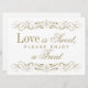 Decorative swirls and flourishes frame this elegant vintage inspired "Love is Sweet, please enjoy a Treat" dessert table sign. White and antique gold design colours.