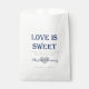 A custom favour bag reading "Love is sweet. Thank you for sharing our special day." Personalized with the bride and groom's names written over a heart, and the wedding date. Perfect for favours, candy buffets, and more!