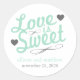 Old Fashioned Love Is Sweet Labels / Stickers (Dark Grey / Light Pale Pastel Mint Green / White)...These fun and chic love is sweet labels / stickers have an old fashioned feel to them with a romantic feel from the two hearts and are ideal for wedding favours or a wedding candy bar / buffet full of chocolate, suckers, lollipops, taffy, and sugar. Let your guests know to take a treat home with them to remember your wedding. The design features an array of whimsical fonts with the bride and groom names as well as the wedding date. Great for a candy themed wedding. Ideal for a destination wedding. Perfect for any bride or groom with a sweet tooth. Great idea for a bridal shower or bachelorette party too. Fully customizable...just change the names and the dates and your favour stickers are ready to be used. Available in a wide range of colours to match your wedding colours. See WindyCityStationery.com for our complete line of "Love Is Sweet" labels in a wide range of colours as well as matching "Love Is Sweet" postage stamps, thank you cards, return address labels, save the dates and more.