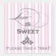 Love is sweet pink candy stripe Sticker. Great for Dessert tables, Candy buffets or cupcake tables at weddings, birthday parties, Baby showers, Communion, Confirmations and lots more! Design features background with pink and white stripes.