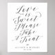 Elegant Calligraphy Script Wedding Sign - Love is sweet please take a treat. Sign in beautiful flowing fancy letters and your personalized text. A stylish yet simple formal design in black and white or any background colour you choose. Just click the customize further link, shown under the text personalization area on the right, and choose your custom colour background. This sign poster template makes it fast and easy to create stunning additions to your wedding decor. Signs can be enlarged, there are many sizes to choose from, as well as options for custom framing and matting. wedding custom signage.