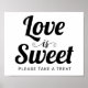 Love is Sweet typography wedding candy bar sign. The phrase"Love is sweet" in black bold typography adorns this desert table wedding sign. There is also the text "please take a treat.