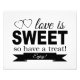 This sweet and simple sign features the words "Love is SWEET so have a treat Enjoy!" in a combination of black swirl and block fonts, and is accented by 2 hearts. It will be the perfect compliment to the candy bar buffet, cookie buffet or dessert table at your wedding.