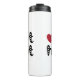 A simple, playful design with images of a heart for saying you love things hot. A red heart is used to say "Love", with smaller hearts that assume the color of the chosen background cut out in the letters. The color of the red heart and the texts can be individually customized.