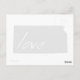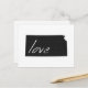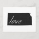 Kansas love is easy to spread everywhere through the mail with this post card. With the shape of the Sunflower state of Kansas filled in black and the word love written inside with white hand written lettering the message is clear that you love the State of Kansas.